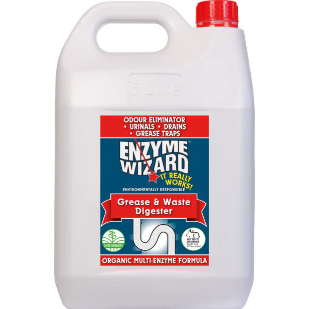 Enzyme Wizard Grease and Waste Digester breaks down stubborn grease, fats, and organic waste naturally. This powerful 5L formula uses enzymes to eliminate odours and keep drains flowing freely. Perfect for kitchens, bathrooms, and commercial spaces. Safe for pipes and septic systems. One bottle handles multiple applications, making it an economical choice for regular maintenance.